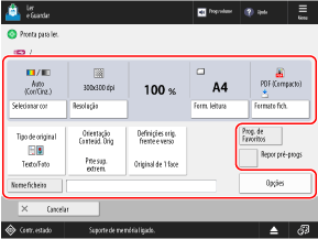 Se colocar um original no vidro de exposição e programar a sua leitura, ou se programar uma leitura utilizando a cópia contínua de trabalhos, o ecrã para a leitura de originais adicionais aparece.