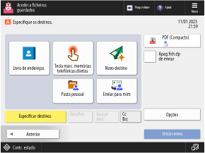 Carregue em [Livro de endereços], [Tecla marc. memórias telefónicas diretas] ou [Novo destino] e especifique o destino no Livro de endereços ou insira-o diretamente.