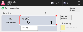 O papel atualmente definido para ser utilizado e o número de impressões são exibidos no centro do ecrã. Verifique estas definições para garantir a impressão correta.