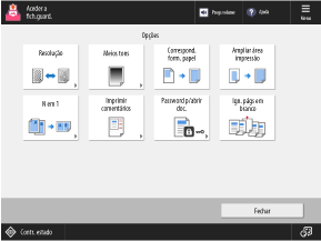 No ecrã de programações de impressão, pressione [Opções] para exibir a tela [Opções].