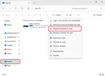 Clique com o botão direito do rato em [This PC] e depois clique em [Mapear unidade de rede].