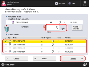 Especifique o ficheiro que pretende inserir e a posição onde inserir e prima em [Seguinte].