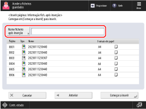 Ao inserir o nome do ficheiro, pressione [Nome ficheiro após inserção], insira o nome do ficheiro e pressione [OK].