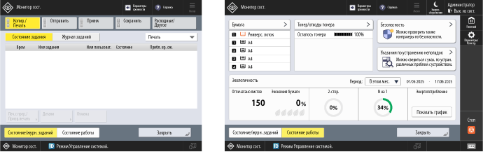 Можно выбрать [Состояние/журн. заданий] для проверки состояния обработки и истории каждой функции, а также оставшегося количества расходных материалов и компонентов.