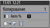 Отображение настроек номера или имени ящика места сохранения, формата оригинала, коэффициента копирования и 2-сторонней печати.