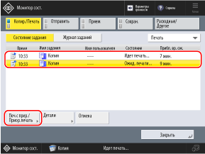 Выберите зарезервированное задание копирования, которое вы хотите задать в качестве задания с прерыванием, и нажмите [Печ.с прер./Приор.печать].