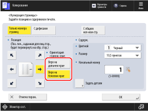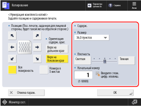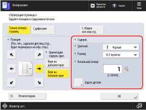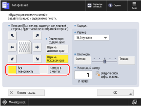 * Нельзя выбрать [Вся поверхность] и [Номера в 5 местах], если параметры настроены на добавление других данных к номерам комплектов копий.