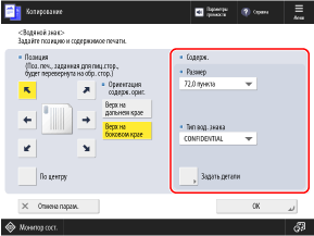 Можно нажать [Задать детали], чтобы изменить страницы, на которых будет печататься водяной знак, или изменить способ печати (прозрачная печать или печать с наложением).