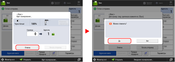 При отправке факса с аппарата вы можете отменить операцию отправки факса, следуя инструкциям на экране.