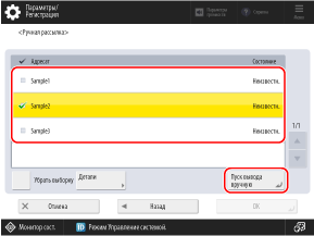 Установите флажки для адресатов и нажмите [Пуск вывода вручную].
