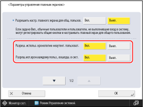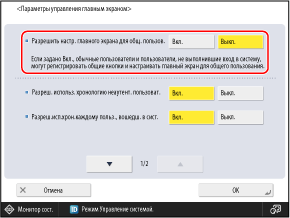 Установите для этого параметра значение [Вкл.], чтобы разрешить пользователям, не являющимся администраторами, добавлять общие кнопки и вносить изменения в параметры [Настроить для общ. пользов.].