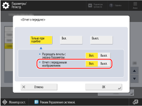 Если требуется печать первой страницы оригинала в отчете, задайте для параметров [Отчет с переданным изображением] и/или [Отчет с переданным цветным изобр.] значение [Вкл.].