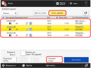 Если отображается [Печать списка заданий], выберите задание, которое требуется отменить, из списка заданий на печать и нажмите [Отмена].