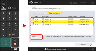 Стоп], выберите задание, которое требуется отменить, из списка заданий на печать и нажмите [Отмена].