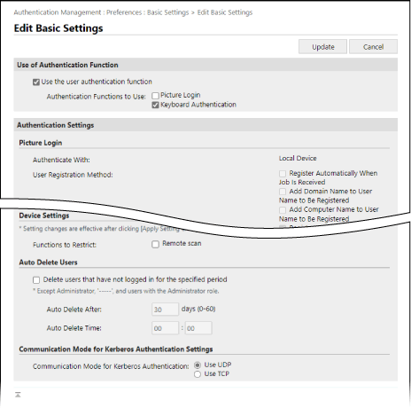 Установите этот флажок, чтобы автоматически удалять зарегистрированных на локальном устройстве пользователей, которые не входили в систему аппарата в течение указанного периода времени. В [Auto Delete After] и [Auto Delete Time] введите количество дней с даты последнего входа в систему до выполнения автоматического удаления и укажите время выполнения удаления.
