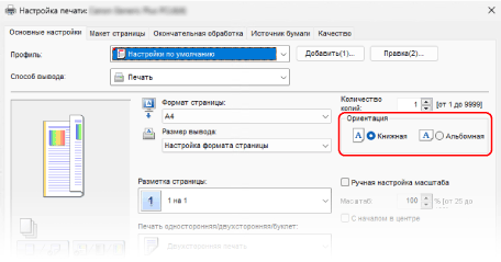 В [Ориентация] на вкладке [Основные настройки] убедитесь, что для [Ориентация] установлена та же ориентация, которую вы установили на шаге