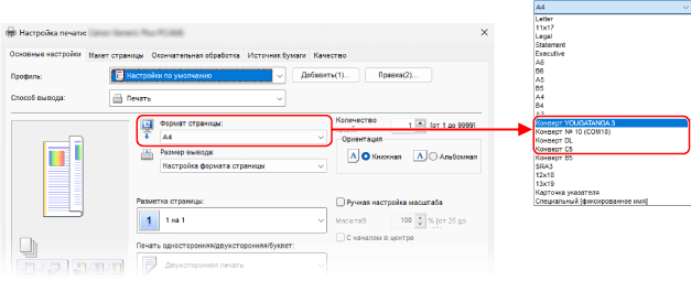В списке [Формат страницы] на вкладке [Основные настройки] выберите формат конверта.
