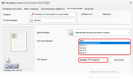 В окнах [Источник бумаги] и [Тип бумаги] на вкладке [Источник бумаги] выберите универсальный лоток и конверт.