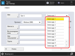 В этом разделе описывается, как зарегистрировать адресатов в общем списке адресов (списки адресов с 1 по 10) с помощью панели управления.