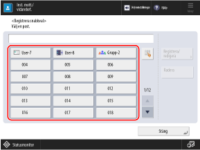Du kan också redigera och radera mottagare på en snabbvlasknapp från skanningsskärmen (Scanna och skicka) eller faxskärmen.
