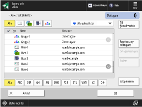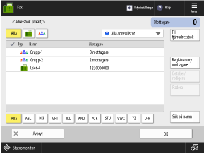 Du kan ange mottagare som är registrerade i adressboken genom att öppna adressboken från skanningsskärmen (Scanna och skicka) eller faxskärmen.