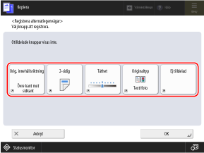Du kan byta ut följande knappar som visas på skärmarna för skanning (Scanna och skicka), fax och kopiering med knapparna i [Alternativ] och dölja knapparna.