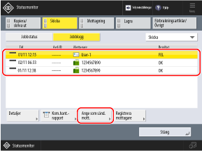 Du kan ange mottagare som har använts tidigare genom att ta fram sändningsloggen från skärmen [Statusmonitor] på kontrollpanelen.