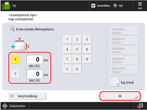 Tryck på [Reg. format]  välj den knapp som du vill registrera storleken på  tryck på [Registrera/redigera]  ange längderna för sidorna [X] och [Y]  tryck på [OK]  [Stäng]