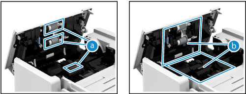 Torka av valsarna inuti dokumentmataren och dokumentmatarens skanningsyta för att ta bort eventuellt tonerpulver och damm som har fastnat.