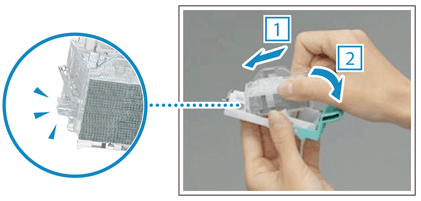 Håll i den gröna fliken på klammerpatronen och tryck in det så långt det går.