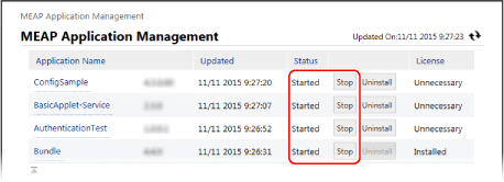 Klicka på [Started] eller [Stopped] för MEAP-applikationen som du vill starta eller stoppa.