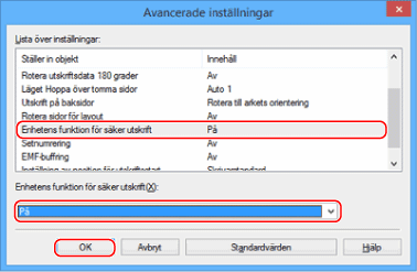 Klicka på [Enhetens funktion för säker utskrift], välj [På] och klicka på [OK].
