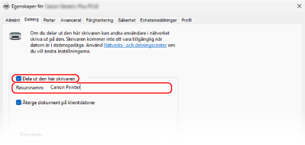 Konfigurera inställningarna för att dela skrivaren på datorn som ska fungera som skrivarserver så att andra datorer i nätverket kan använda skrivarservern.