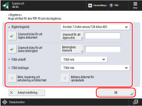 Om [Format till PDF/A] är valt, inaktivera [Format till PDF/A] och tryck sedan på [Kryptera].