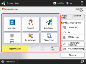 Med Enkel scanning och sändning/Enkel scanning kan du konfigurera grundläggande funktioner som de angivna mottagarna och färginställningarna med några enkla knapptryck.