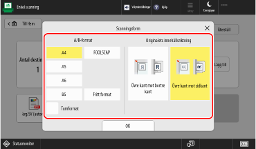 Tryck på knappen för inställning av skanningsstorlek och välj skanningsstorleken och originalets orientering.