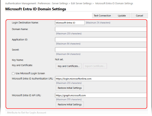 Konfigurera Active Directory-, LDAP-servern eller Microsoft Entra ID-informationen i [Authentication Server].