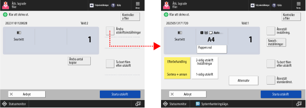 Tryck på [Ändra utskriftsinställningar] längst upp till höger på skärmen för att konfigurera följande inställningar: