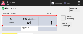 Den inställda pappret som ska användas och antal utskrifter visas i mitten av skärmen. Kontrollera dessa inställningar för att säkerställa korrekt utskrift.