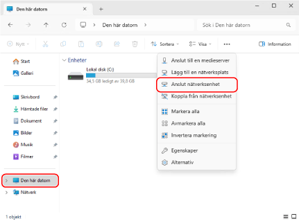 Högerklicka på [Den här datorn] och sedan på [Anslut nätverksenhet].