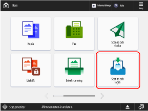 * Du kan även skanna ett dokument från [Åtkomst lagrade filer] på skärmen [Hem] och spara det på ett USB-minne. Att använda [Åtkomst lagrade filer] för att spara data är användbart om du vill skriva ut filen direkt från maskinen.