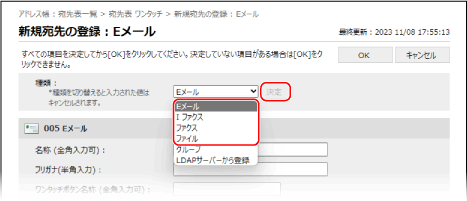 宛先の種類を選択し、[決定]をクリックする