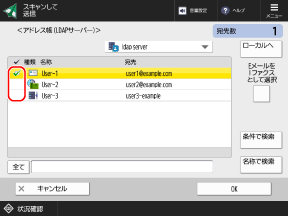LDAPサーバーでユーザー情報が管理されている場合は、操作パネルのスキャン(スキャンして送信)/ファクスの画面からその情報を検索して、宛先に指定できます。