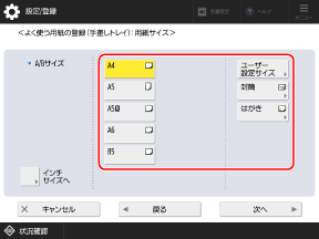 また、手差しトレイに用紙をセットしたときに表示する画面を、「よく使う用紙」を選択する画面にして、ワンタッチで用紙サイズと用紙種類を設定できるようにすることもできます。