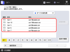通知先には、アドレス帳に登録されている宛先(個人宛先表とユーザーグループ宛先表の宛先は除く)を設定できます。