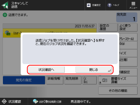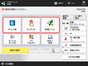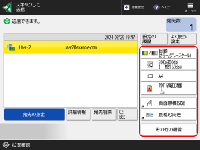 [設定の履歴]を押すと、過去にスキャンデータを送信したときの設定を呼び出すことができます。送信したときの宛先も、設定と併せて反映されます。