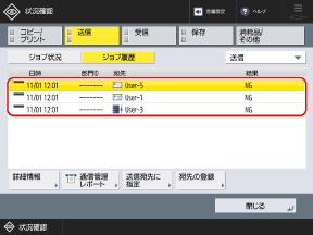 手順3で、ジョブを選択して[送信宛先に指定]または[宛先の登録]を押すと、送信履歴と同じ宛先を指定したり、アドレス帳に宛先を登録したりできます。