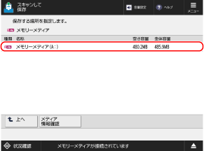 [メディア情報確認]を押し、USBメモリーを選択して[詳細情報]を押すと、USBメモリーのシリアルナンバーや空き容量などを確認できます。