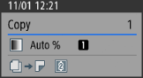 Displays the number of copies, color, copy ratio, paper source, 2-sided, N on 1, and staple (for the model with the finisher) settings.