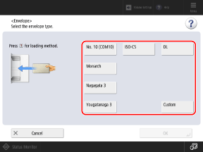 When you press [Custom], [Next] appears. Press [Next], enter the envelope size including the flap length of the loaded envelopes (length of side), and then press [OK].